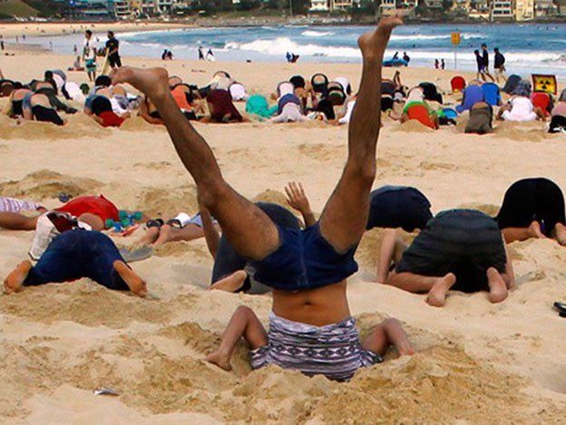 Los activistas cavaron agujeros en la arena donde hundieron sus cabezas, emulando a los avestruces, que supuestamente meten su cabeza en la arena en un intento por evitar el peligro.