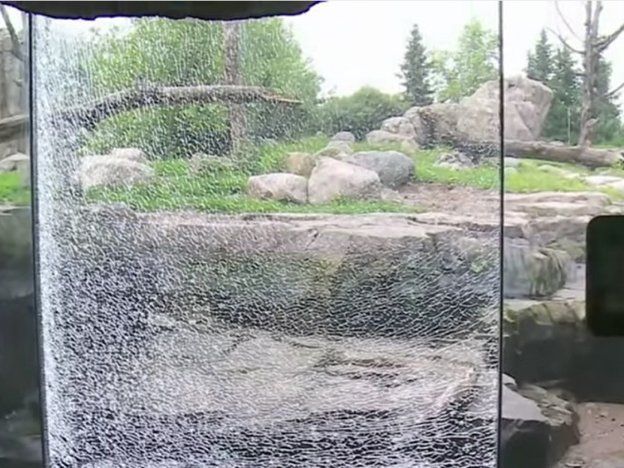 La galardonada exhibición "Russia's Grizzly Coast" en el zoológico de Minnesota atrae a la gente en parte debido a la proximidad de los osos con los visitantes mientras todavía permanecen en un hábitat natural simulado.Pero los visitantes al zoológico en Apple Valley no esperaban que los osos pardos, a veces llamados grizzlies, se acercaran más de eso, hasta que el lunes uno de los tres osos de la exhibición destrozó parte del cristal de varias hojas del recinto con una piedra. El cristal permaneció en su sitio.
