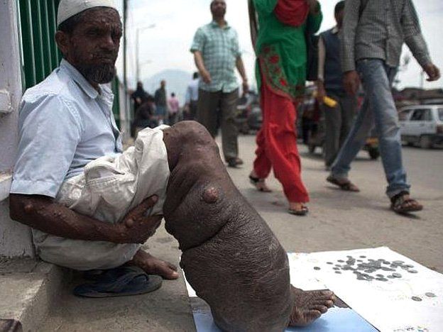 Sahajul Sheikh, un hombre de 46 años que pasa sus días mendigando por las calles de la Srinagar (en la India), se ha convertido en el nuevo "hombre elefante" debido a la Elefantiasis, una extraña enfermedad que ha provocado que su pierna derecha se hinche de manera exagerada, según afirma la versión digital del diario Daily Mail.