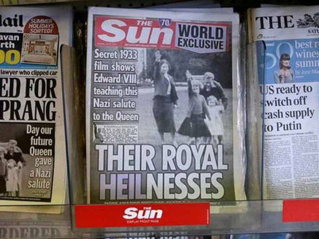 El diario británico The Sun publicó en su edición de hoy una imagen de la reina Isabel II tomada en 1933 -cuando tenía 7 años- que la muestra haciendo el saludo nazi en los jardines del palacio escocés de Balmoral. La publicación generó una rápida reacción del palacio de Buckingham, que la calificó de "engañosa y decepcionante".La reina aparece en la fotografía junto a su madre, Isabel; su hermana, la princesa Margarita, y su tío, por entonces príncipe de Gales y más tarde rey Eduardo VIII. La foto fue extraída de un filme realizado durante las vacaciones de verano de la familia real en Balmoral. En la cinta también aparece haciendo el saludo nazi la reina madre.