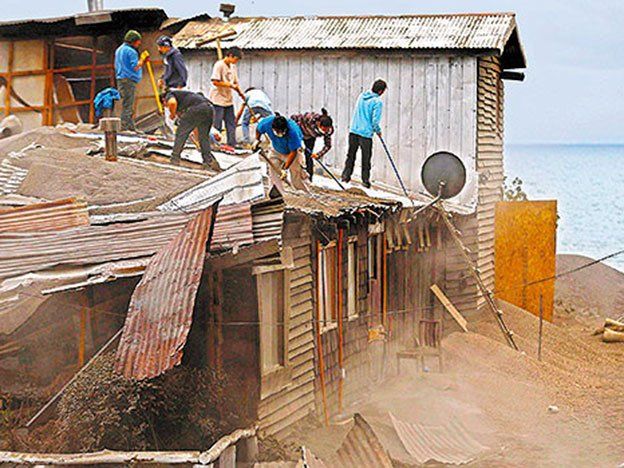 La urgencia responde a informes meteorológicos que pronostican unos pocos milímetros de lluvias el lunes por la noche y precipitaciones abundantes hacia el fin de semana."El material con las lluvias se va a solidificar. El apuro es sacar todo esto antes de las lluvias porque si llueve el material absorbe el agua, aumenta el peso y se caen los techos, se cae todo", dijo a The Associated Press Víctor Toledo, de 45 años, un promotor turístico de Ensenada, la primera localidad en ser evacuada.Las autoridades están centradas en el despeje de cenizas de pueblos y cauces de ríos por temor a que la lluvia las transforme en aluviones que ocasionen más daños.El académico especialista en volcanes de la Universidad de Concepción, José Luis Palma, declaró que "por lo general los lahares (aluviones) que se generan en las proximidades de los volcanes tienen mucha carga sólida y pueden transportar rocas de gran tamaño, lo que provoca que el impacto de ellos sea muy grande".Toledo anticipó que "las consecuencias económicas y sociales que se vienen son muy duras. Cuando esto pase y volvamos a casa la situación va a ser compleja para la gente que sobrevive de agricultura de pequeña escala".Los agricultores que tienen los medios están moviendo su ganado fuera de la zona de exclusión. Otros esperan ayuda para alimentar a sus animales.Ema Budinich, gerente de estudios de la Sociedad Nacional de Agricultura, precisó que en la región de Los Lagos, donde se encuentra el volcán, hay un millón de cabezas de ganado, 30% de la existencia de Chile, cuya situación precisa se desconoce.El ministro de Agricultura Carlos Furche declaró que están llevando forraje a animales que permanecen en la zona de exclusión y anunció la entrega de un bono en 1,5 millón de pesos, 2.400 dólares, a los agricultores y ganaderos más afectados.La cría del salmón es otra actividad económica en la región. En la zona de exclusión había siete instalaciones acuícolas, con 25 millones de peces, informó Felipe Manterola, gerente general de Salmón Chile, que agrupa a los productores chilenos de salmón, un importante producto de exportación.