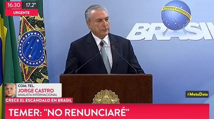 El presidente de Brasil, Michel Temer, negó hoy la renuncia al cargo en medio de la mayor crisis de su gobierno, originada por grabaciones de supuestas negociaciones por sobornos, por las cuales fue abierta una investigación sobre su conducta en el Supremo Tribunal Federal."No renunciaré; repito, no renunciaré", dijo Temer en un pronunciamiento en el que clamó su inocencia frente a la grabación que le realizó el delator Joesley Batista, dueño de la empresa frigorífica JBS.