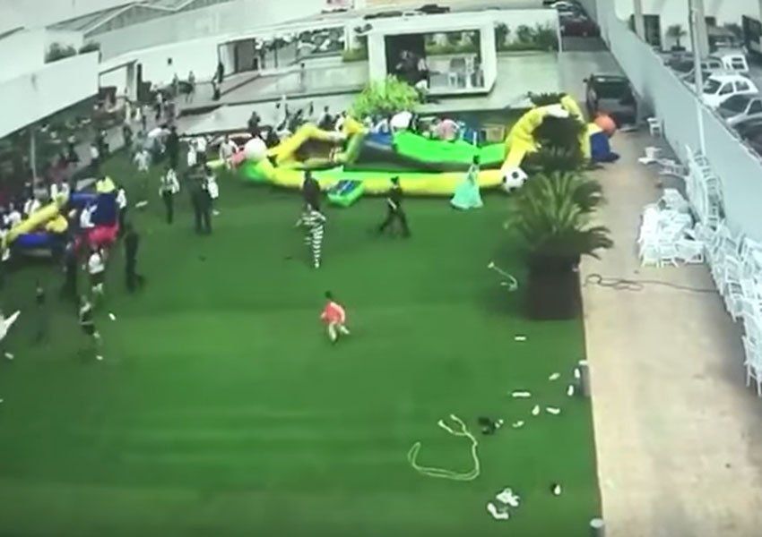 En el video de seguridad se aprecia como las ráfagas mueven de un lado a otro los juegos inflables, donde se encontraban los pequeños divirtiéndose, ante la mirada atónita de los asistentes y el terror de los pequeños que fueron lanzados por los aires.
