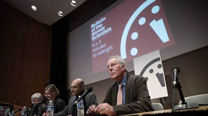Los responsables del Reloj del Fin del Mundo adelantaron en 30 segundos la cuenta atrás simbólica para una potencial catástrofe global. El minutero se acercó más a la medianoche debido a las declaraciones del nuevo presidente de Estados Unidos, Donald Trump, sobre las armas nucleares y el cambio climático.En un comunicado sobre la decisión del jueves, el Bulletin of the Atomic Scientists citó una "confianza irregular del público en las instituciones democráticas necesarias para gestionar las grandes amenazas globales".Las "campañas de engaño" de Rusia para interferir en las elecciones de Estados Unidos, afirmó el boletín, han hecho el mundo más peligroso al poner "en duda la democracia estadounidense y las intenciones rusas".El Reloj del Fin del Mundo se sitúa ahora a dos minutos y medio de la medianoche, su punto más avanzado desde la década de 1950.El reloj es una representación visual de lo cerca que la institución ve una catástrofe global provocada por armas nucleares, cambio climático y nuevas tecnologías.