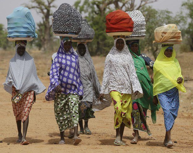 La foto del día.Ellas caminan con soltura mientras llevan, en perfecto equilibrio, sus mercancías en la cabeza. Recorren un sendero de tierra que se encuentra junto a un campamento donde conviven mujeres y niños que han sido rescatados por soldados nigerianos de los extremistas de Boko Haram.
