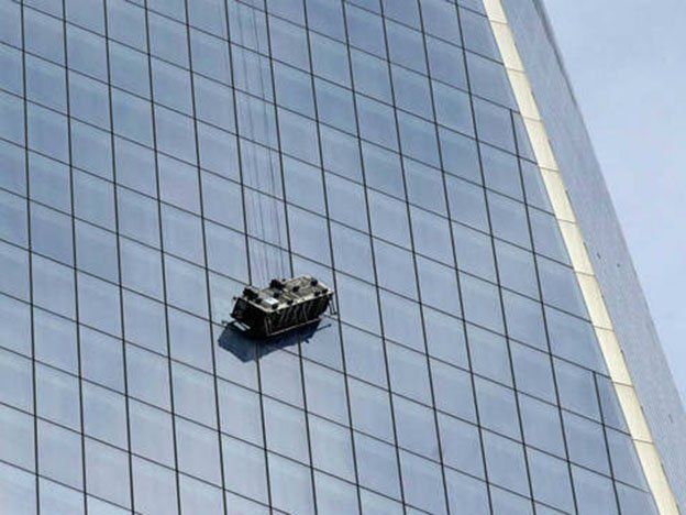 Uno de los cables se soltó, aparentemente, mientras subía a la cima de la torre, la más alta de Estados Unidos, y la plataforma se quedó colgada, muy inclinada, a cerca de 240 metros de altura.