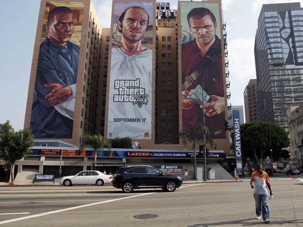 La nueva versión de la serie de acción y aventuras desarrollada por Rockstar Games está centrada en un trío de asaltabancos de Los Santos, una ciudad que tiene reminiscencias con Los Ángeles. El juego tiene una opción que permite a los participantes hacer actividades virtuales como visitar clubes de desnudistas, contratar prostitutas, así como jugar tenis y manejar una montaña rusa.