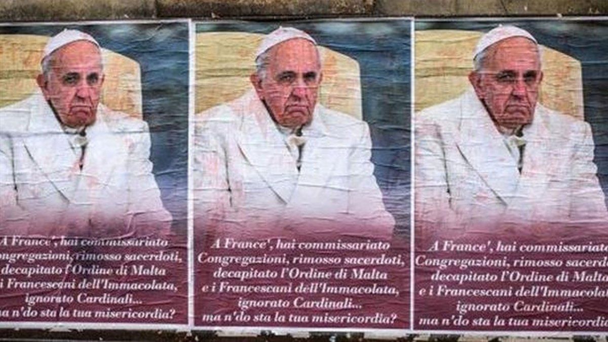 En un fiel reflejo de que no todo el mundo está contento con las reformas que puso en marcha, esta mañana Roma apareció empapelada con centenares de afiches anti- Francisco .En el afiche se ve un primer plano del Papa con rostro adusto. Debajo, sobre un fondo de tono violeta, puede leerse una leyenda en tradicional jerga "romanesca", que dice: "A France' (Francisco en dialecto romanesco) has intervenido Congregaciones, removido sacerdotes, decapitado la Orden de Malta y a los Franciscanos de la Inmaculada, ignorado cardenales... ¿pero dónde está tu misericordia?".