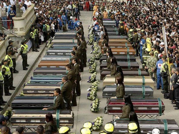 En medio de un dolor que no cesa, este sábado fueron sepultados 16 de las víctimas del deslave que dejó 92 muertos en la población de Salgar (noroeste), en una ceremonia colectiva a la que asistió el presidente de Colombia Juan Manuel Santos.La ceremonia colectiva, la segunda que se realiza luego de la tragedia que cubrió a la pequeña localidad del Departamento de Antioquia el pasado lunes cuando se desbordó la quebrada Liboriana, se realizó en medio de una multitud silenciosa, que se congregó en la iglesia San Juan Evangelista de la población.