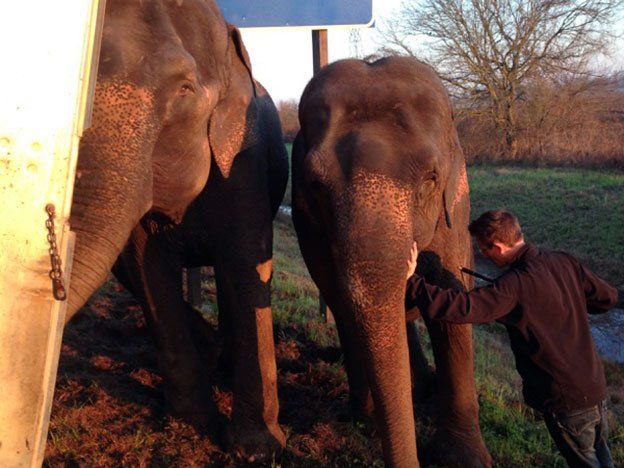 El vehículo se estaba inclinando hacia una zanja, pero el conductor llevó a dos de los elefantes hacia la cuesta entre el camión y la zanja, y los utilizó para sostenerlo.