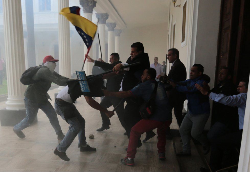 Cerca del mediodía de ayer manifestantes que desde temprano protestaban en varios puntos del centro de Caracas ingresaron a los patios del Congreso luego de que el jefe de la Guardia Nacional del Palacio Legislativo les autorizó el ingreso. Entonces se abalanzaron hacia la entrada de la sala protocolar de la Asamblea y allí se enfrentaron a un grupo de diputados opositores y empleados del Congreso.