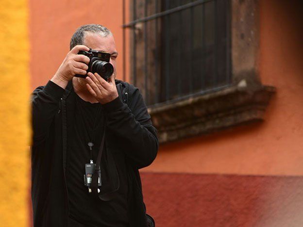 A unos cinco grados centígrados y con el elemento místico de la neblina matinal por sobre la emblemática torre de la Parroquia de San Miguel Arcángel como fondo, el fotógrafo neoyorquino puso énfasis en recordar que en México se celebra el Día de Muertos.