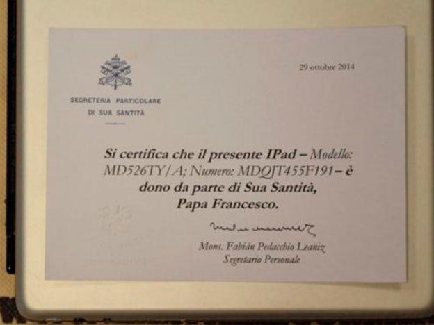 La tablet, que también viene con un certificado que acredita que el aparato es donado por el pontífice, fue regalado por el papa a Gonzalo Aemilius en una de sus visitas al Vaticano. A su vez, el sacerdote lo obsequió al Liceo Francisco. Lo recaudado en la subasta será donado a la institución