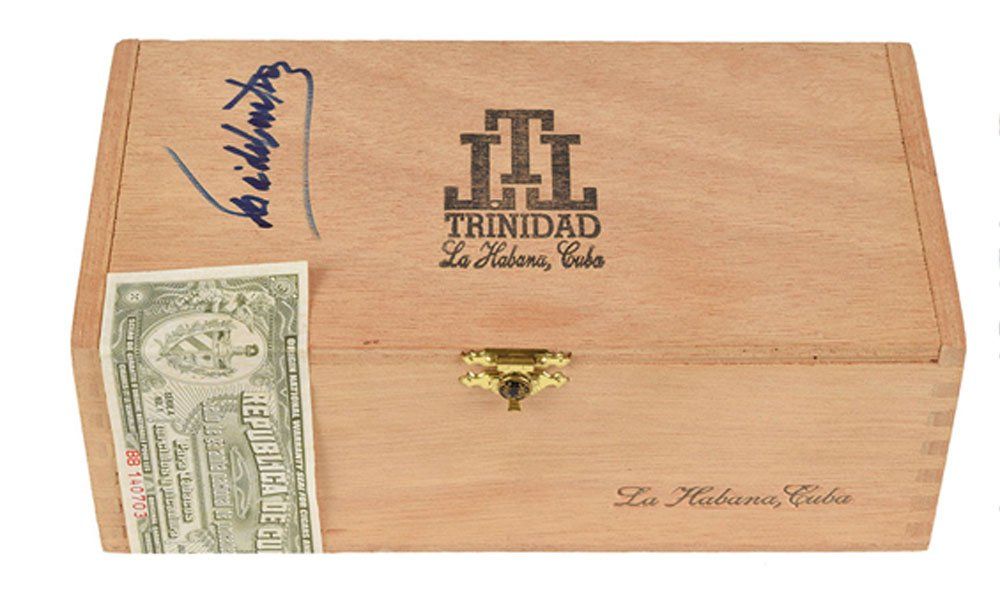 La caja de madera de puros Trinidad Fundadores está firmada en azul por el gobernante cubano. Está acompañada de una foto de Castro firmando la caja para la filántropa doctora Eva Heller en 2002.
