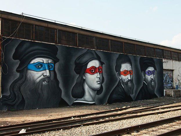 El artista neozelandés Owen Dippie reside en Nueva York, y allí pintó un mural con estos cuatro artistas del Renacimiento: Leonardo, Rafael, Miguel Ángel y Donatello, como las 4 tortugas ninja.Pintado en una pared junto a las vías del tren en Brooklyn, Dippie retrató a los cuatro renacentistas con las máscara de las tortugas ninja que llevan sus nombres.