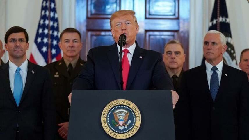 El mandatario brindó una declaración en la Casa Blanca acompañado por el vicepresidente, Mike Pence; el secretario de Estado, Mike Pompeo; el titular del Departamento de Defensa, Mark Esper; y líderes militares.