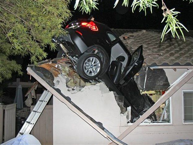 Un BMW deportivo impactó contra el techo de una casa y destrozó el garaje en Escondido, California.