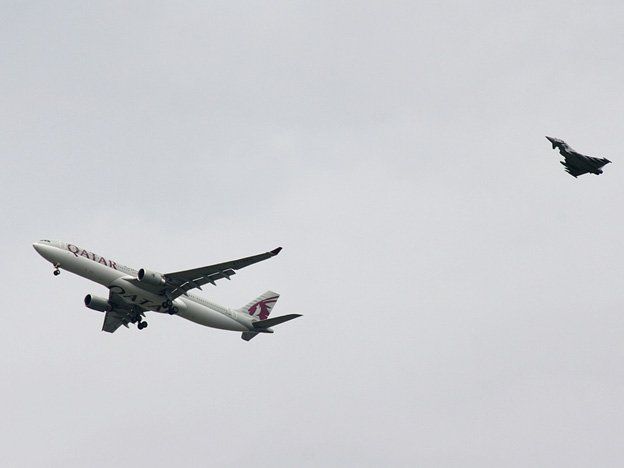 Un hombre fue arrestado y acusado de realizar una falsa alarma de bomba luego que un avión Qatar Airways aterrizó bajo escolta de jets militares en el aeropuerto de Manchester, Inglaterra.