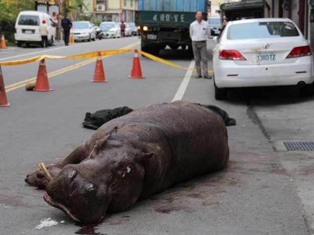 En imágenes difundidas en televisión, puede verse al gigantesco animal yaciendo en la carretera después de saltar del camión, aterrizar en un coche estacionado y rodar hasta el asfalto. El sonido de la colisión, en la que se rompió una pata, sorprendió a los residentes de la zona, que llamaron a la policía del condado de Miaoli.