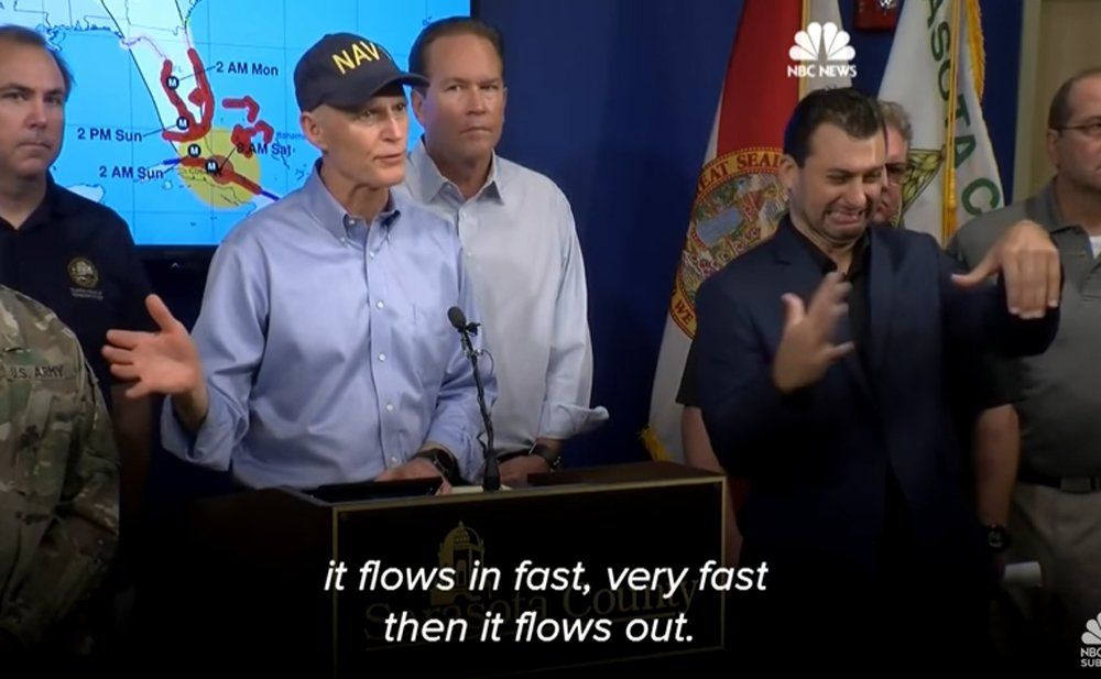Estos días han sido pródigos en ruedas de prensa en el estado de Florida en las que se alertaba de los efectos devastadores del huracán Irma. Pero más allá del fenómeno atmosférico, esta alerta ha dejado alguna escena hilarante, como la que protagonizó un intérprete de lengua de signos. Fue este sábado en una rueda de prensa de Rick Scott, gobernador de Florida, en la que alertaba a la población del peligro de la tormenta. A su izquierda, un intérprete de lengua de signos comunicaba lo mismo para las personas con discapacidad auditiva. Pero a un numeroso grupo de internautas, lo que más le llamó la atención fue la expresividad del intérprete, hasta el punto de convertirlo casi en una celebridad gracias a tuits como el de la rapera Missy Elliott: "No puedo dejar de ver cómo traduce esto y con tanta 'salsa". Los intérpretes de lengua de signos son muy expresivos con el rostro. Para las personas sordas, es muy importante ver la expresión facial para comprender el contexto del mensaje que se les está transmitiendo. Un gesto facial neutro o contrario puede suponerles dificultades para entender el mensaje.