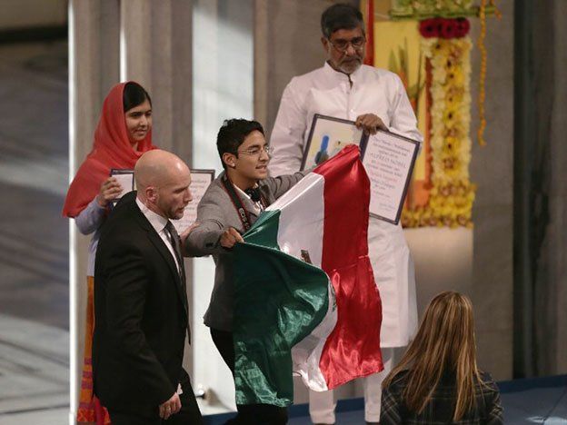 Un estudiante mexicano, que había solicitado asilo político en Oslo, irrumpió este miércoles en el acto de entrega del galardón llevando una bandera de su país manchada de rojo y le pidió a la ganadora Malala Yousafzai que no se olvidara de México.