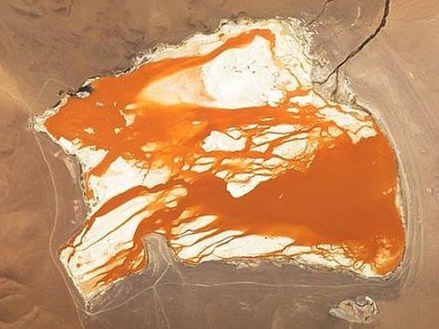 Un astronauta a bordo de la Estación Espacial Internacional tomó esta fotografía de la brillante y colorida Laguna Colorada, en los Andes bolivianos. La falta de neblina atmosférica en la altura –el lago de alta se encuentra 4.300 metros sobre el nivel del mar– contribuye a obtener imágenes de la región especialmente claras. El fuerte color rojo-marrón de este lago de baja profundidad de 10 kilometros de largo proviene de las algas que crecen en el agua salada. En ocasiones, el lago tiene fases verdes debido a la visualización algas diferentes colores diferentes.El tipo de algas en un momento dado se determina por el cambio de la salinidad y la temperatura del agua. Como el agua del lago se evapora en el clima del desierto, se convierte en una solución salina. Antiguas costas muestran que el lago ha sido mayor en el pasado.