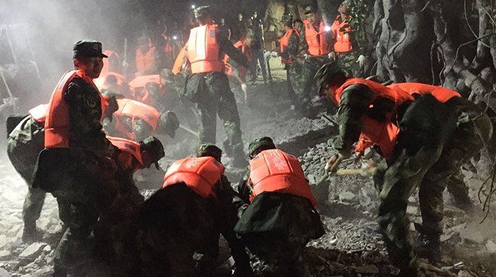 La televisora estatal China Central Television mostró imágenes del momento en que rescatistas ataviados con monos naranjas encontraron el cuerpo y utilizaron detectores para hallar sobrevivientes en la oscuridad de la noche, poniendo a una niña a salvo y guiando a otras personas a lo largo de una carretera llena de escombros.
