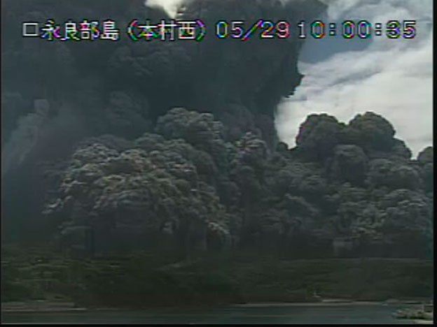 Un volcán hizo erupción el viernes en forma espectacular en una pequeña isla del sur de Japón, arrojando rocas y columnas de ceniza a una altura de 9 kilómetros.