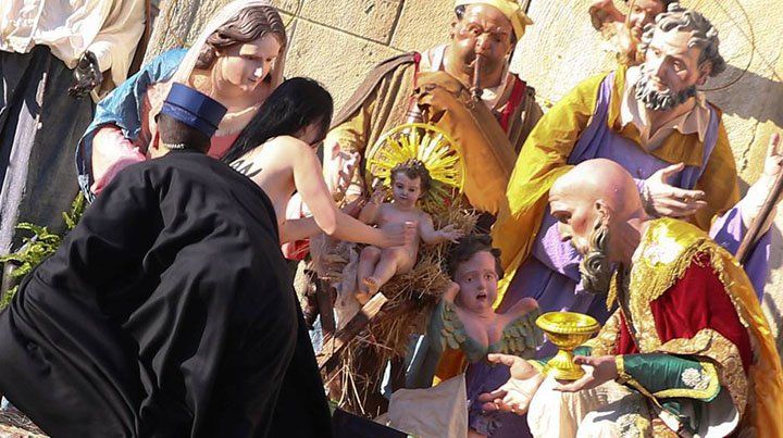 Una "femen" ucraniana irrumpió con los senos al aire en el pesebre gigante del Vaticano en la plaza de San Pedro, y se apoderó de la estatuilla del niño Jesús gritando en inglés "¡Dios es mujer!", informó este lunes la policía.