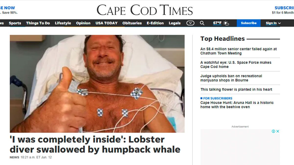 "Hola a todos, quiero aclarar lo que me sucedió hoy. Buceaba para buscar langostas cuando una ballena jorobada intentó comerme. Estuve dentro de su boca cerrada durante 30 a 40 segundos, antes de que emergiera a la superficie y me escupiera. Tengo moretones por todos lados pero ningún hueso roto. Agradezco a los salvavidas de Provincetown por sus cuidados y ayuda", reveló el pescador.
