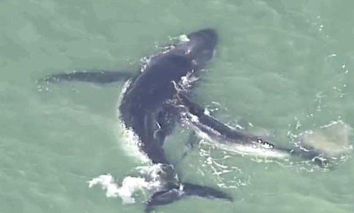 Al ver a su madre en serias dificultades, el ballenato empezó a empujarla para alejarla de la orilla.