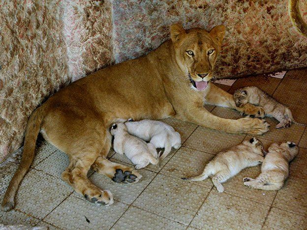 El propietario Malik Fazal Abbas dijo que Reina, de 4 años, está con él desde que tenía dos meses de edad. Se apareó con un macho que también vive en la casa de Abbas, en la ciudad de Multan.Abbas, quien cultiva mangos y algodón, dice que tiene licencia del Departamento de Vida Silvestre de Pakistán para tener a los leones como mascotas.