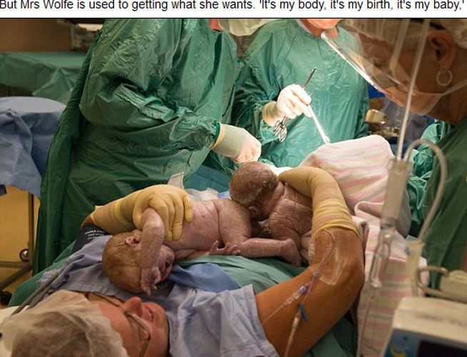 Guiada por los especialistas, Gerri, trajo al mundo a Matilda, la primera de la gemelas y la colocó sobre su pecho. Pasado un minuto le ordenaron, "¡venga a por la otra!" y así fue como nació la segunda, Matilda.