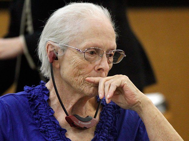 La acusada Alice Uden, con lentes de marco metálico, un auxiliar auditivo proporcionado por la corte y vistiendo un traje azul, estuvo sentada calladamente en su silla de ruedas antes de hablar en la audiencia.