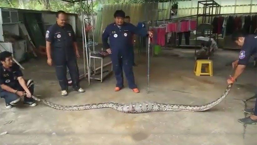 Uraiwan Seksuk colgaba ropa en una soga del patio de su vivienda de Tailandia cuando sintió una extraña vibración en el suelo y vio que, en uno de los bordes del concreto, asomaba la cola de una serpiente.En principio, el personal de emergencia que se desplazó hasta la vivienda de esa mujer no podía sacar a ese animal que pesaba alrededor de 20 kilogramos, ya que la mayor parte de su cuerpo estaba bajo el cemento, con lo cual tuvo que intervenir la Policía local.Tras romper el suelo del patio con una maza confirmaron que allí había una enorme pitón birmana, una de las especies más grandes del mundo.Regurgitación sorpresaEl reptil se mostró agresivo al sentirse agredido, pero las autoridades lograron inmovilizarlo y llevarlo hasta una camioneta para devolverlo a su hábitat natural.Entonces, ocurrió algo totalmente inesperado. Lentamente, y debido al estrés sufrido, la serpiente regurgitó un lagarto con cerca de 1,5 metros y unos 15 kilogramos que no había digerido.