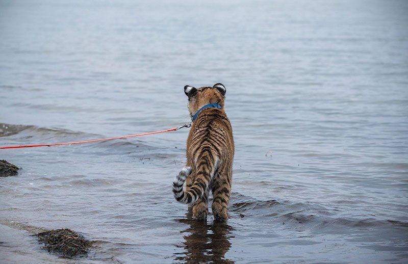 Elsa, de cuatro meses, nació en un circo ambulante y fue rechazada por su madre. Ahora, la pequeña tigresa siberiana vive atendida por una pareja humana, y está creciendo deprisa.