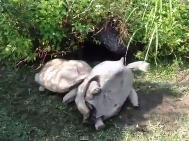 En el vídeo se puede ver a una tortuga gigante acudir a ayudar a su compañera a incorporarse. Usando su cabeza como palanca, consiguió darle la vuelta al otro animal.