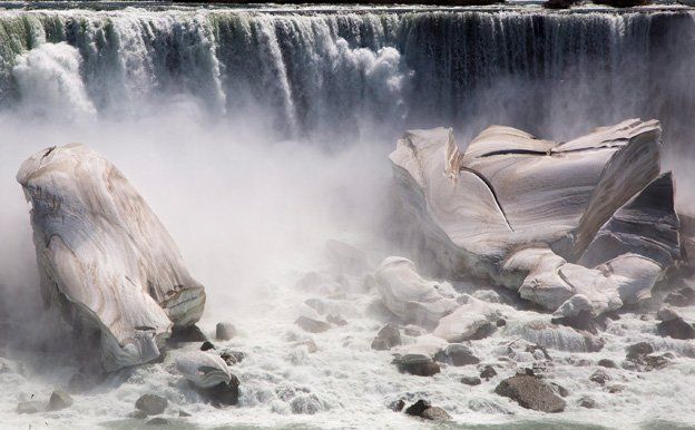 La foto del día. Las capas de nieve y hielo han quedado lentamente expuestas a la erosión del sol y el agua a lo largo de la base de las Cataratas del Niágara.