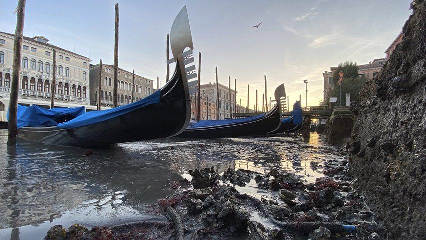 Los canales internos de la ciudad italiana de Venecia perdieron mucha agua este fin de semana debido a una marea baja que dificultó la navegación por algunas rutas. La imagen contrasta con a las severas inundaciones que en noviembre tuvo la histórica ciudad.