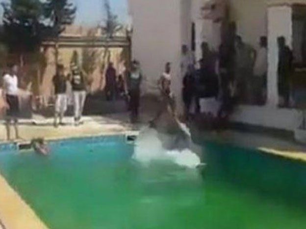 Las imágenes muestran a los hombres rodeando la pileta y tirándose de clavado desde el balcón de la residencia aledaña.