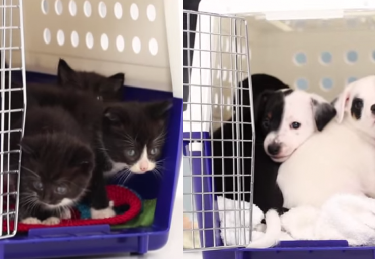 En un extremo pusieron una jaulita con los gatitos bebés y en el otro, a una jaula con los perros cahorritos. Dos mujers abren las jaulas al mismo tiempo para permitir que el encuentro se produzca.