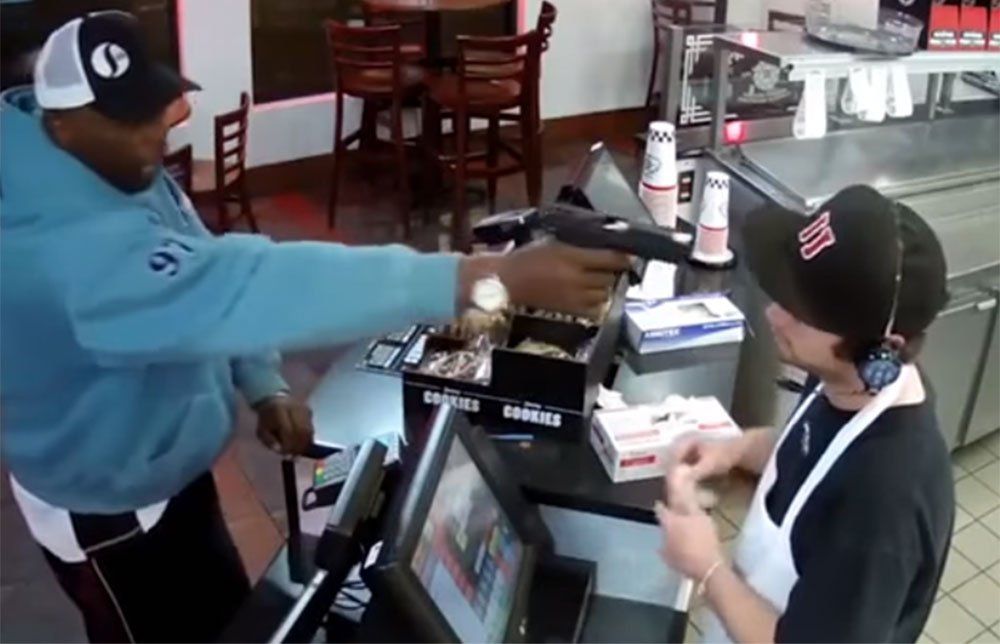 Las cámaras de seguridad del lugar captaron a Terry Rayford, de 54 años, apuntando con una pistola a Tukey Murray, de 24, y a éste quitándose los guantes con toda tranquilidad y le entregando el dinero de la caja.