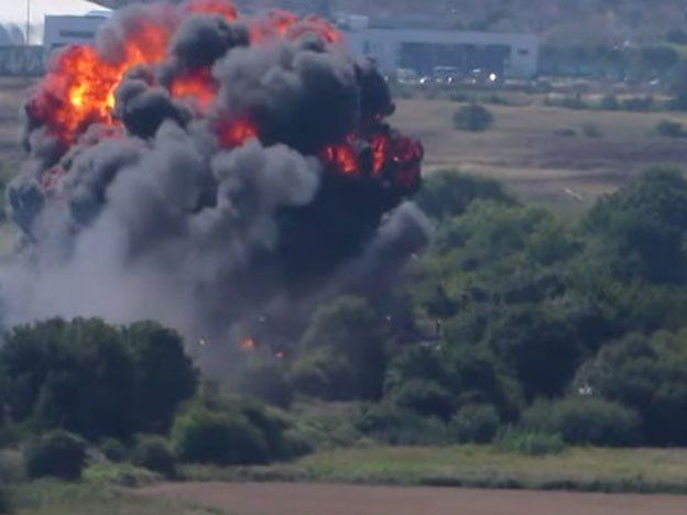Las imágenes difundidas por televisión muestran el avión, un Hawker Hunter de los años 50, estrellándose en un camino cercano luego de intentar hacer un rizo y al parecer perder el control. La policía informó que una persona resultó gravemente herida y estaba siendo atendida en un hospital, en tanto que otras 14 sufrieron lesiones leves.Fuente: NA