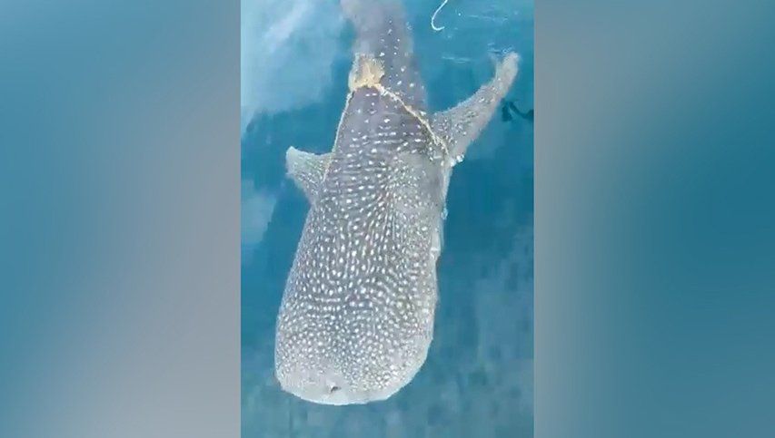 Tras ser liberado, el tiburón ballena agitó su cola varias veces y se alejó de sus salvadores, que a la vez sacaron la cuerda del agua para evitar que otro pez o animal pudiera quedar atrapado nuevamente.