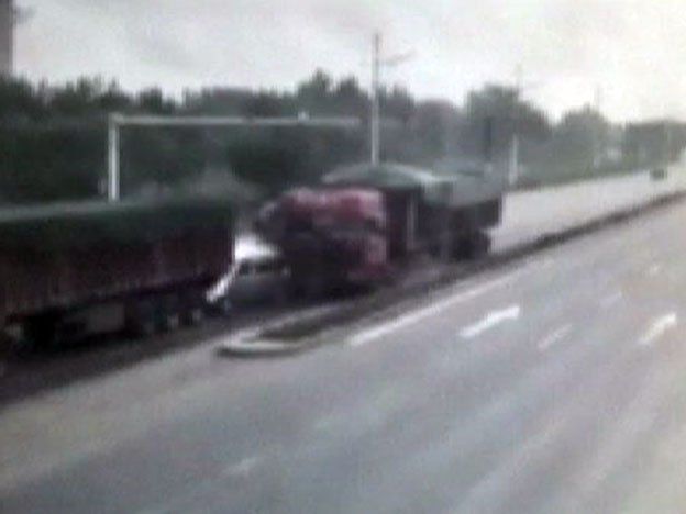 Dos camiones que circulaban por una vía rápida redujeron a chatarra a un minibús, que quedó aplastado entre los dos vehículos. Un menor ha muerto en el suceso.En el minibús viajaban seis personas. Bomberos, transeúntes y policías rescataron a cinco pasajeros, tres de ellos gravemente heridos pero no pudierono hacer nada por salvar la vida de un menor.