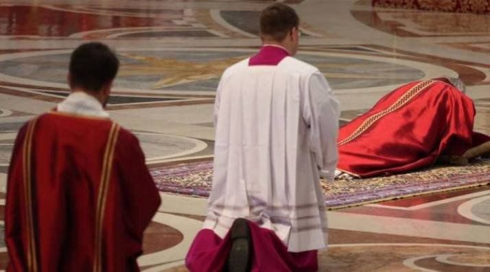 El Santo Padre, postrado en el suelo, oró durante unos minutos junto a todos los fieles arrodillados presentes en la Basílica. Después de ese instante de oración silenciosa, el Pontífice, con la ayuda de los ceremonieros, se puso de nuevo en pie y se procedió a la proclamación de la Palabra.