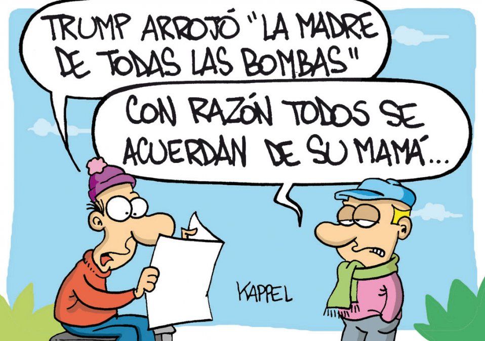 Inicio Mundo Donald Trump El humor de Kappel. 18 de abril de 2017 - 08:44 Y un "cariño" especial para mamá Trump Por UNO Temas relacionados: Donald Trump Estados Unidos El humor de Kappel Humor las más leídas Inversiones En ascenso: el precio del dólar para este martes 28 de abril fue confirmado por los bancos Por Daniel Calivares Tragedia en el escuela Una nena de 6 años se golpeó la cabeza en el recreo y murió Por Pablo González Mundo El aeropuerto sobre la cordillera de los Andes que un país de Sudamérica moderniza con más de US$30 millones y estará listo en 2027 Por Valentina Araya En Las Heras Comenzaron los cortes en el Acceso Norte por la obra del Metrotranvía al aeropuerto Por Analía Doña Te puede interesar Estados Unidos Quién es el hombre que inició el tiroteo en la cena de periodistas a la que asistió Donald Trump Hay un detenido Evacuaron a Trump de una cena entre gritos y presuntos disparos Alerta máxima Caos en una cena de corresponsales de Casa Blanca: tiroteo, un agente herido y Trump evacuado de urgencia