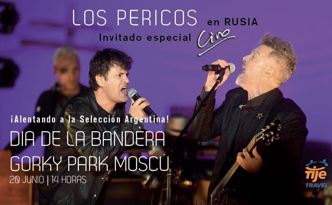 Los Pericos tocarán en el Gorky Park de Moscú para el Día de la Bandera, el miércoles 20 de junio, en pleno mundial de fútbol. Lo harán junto a un invitado especial: Ciro Martinez, ex líder de Los Piojos y actual cantante de Ciro y Los Persas.