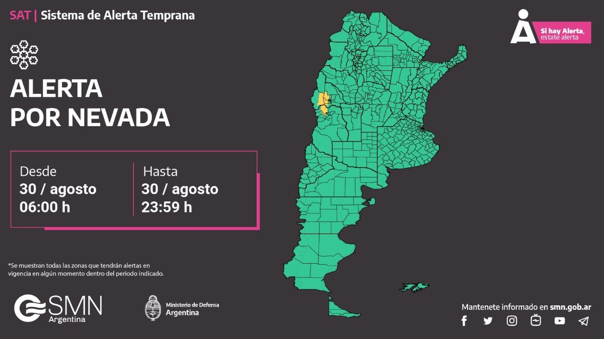 Desde el SMN aconsejan a quienes se encuentren en las zonas afectadas que se mantengan informados sobre el estado del tiempo y que eviten viajar a áreas de montaña durante el periodo de alerta. Además, recomiendan llevar cadenas para la nieve y estar preparados para posibles cortes de energía debido a la acumulación de nieve en los cables.