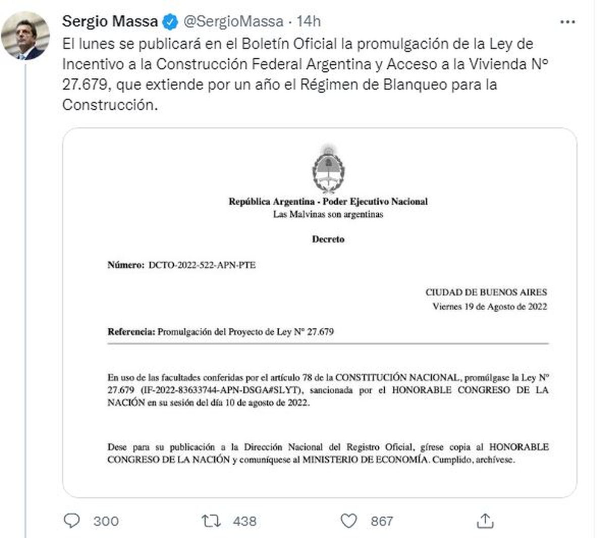 En sintonía, Sergio Massa anunció que la semana que comienza entrará en vigencia por decreto un nuevo Régimen de Blanqueo para la Construcción que prevé beneficios fiscales y financiamiento para empresas del sector.
